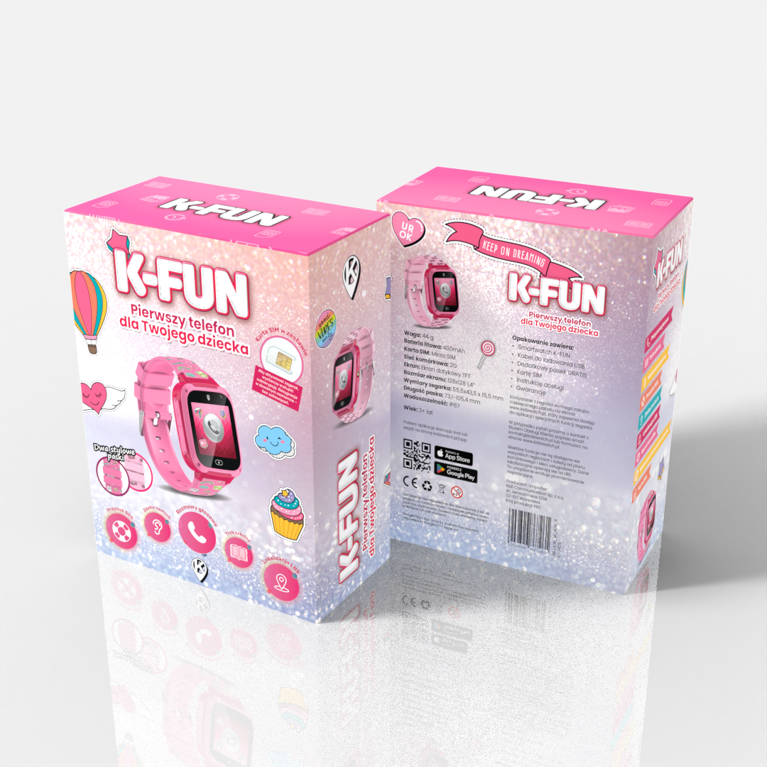 K-FUN to pierwszy telefon Twojego dziecka – w formie kolorowego, inteligentnego zegarka! Umożliwia utrzymanie kontaktu z dzieckiem zawsze i wszędzie dzięki możliwości prowadzenia rozmów i wysyłania wiadomości. Zegarek został wyposażony w przycisk S.O.S., tryb szkolny, aparat i latarkę, dzięki czemu łączy zabawę z bezpieczeństwem.
